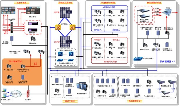 此次建設的SITV 全公司非編制作網(wǎng)絡(luò )系統,要求是一個(gè)具有衛星信號收錄、素材上下載、資源共享、文稿編輯、視音頻制作、審片、演播室播出全數字化新聞非編網(wǎng)絡(luò )系統,并同時(shí)提供靈活的工作流程管理及調整的模式。該系統以網(wǎng)絡(luò )為紐帶,通過(guò)新聞平臺對于資源的統一調配管理,提高新聞節目采、編、播的效率。系統設計和設備規格應符合標清數字電視廣播規范。系統可支持標清多種主流格式編輯;支持上海SMG電視臺的節目收錄和交換,支持新聞素材的遠程網(wǎng)絡(luò )傳輸,文稿系統應與視音頻制作編輯系統有機結合;文稿系統與各通訊社、互聯(lián)網(wǎng)站有良好接口;存儲系統有極高的安全穩定性;新聞播出服務(wù)器(或工作站)有完善的備份措施; 新聞非編網(wǎng)絡(luò )系統將支持新聞業(yè)務(wù),為至少2個(gè)新聞演播室,多個(gè)欄目提供制作和播出平臺,并能為新媒體的發(fā)布提供內容信息。