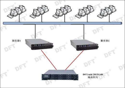 宜春學(xué)院電教中心目前的主要應用是向電教中心的客戶(hù)機提供網(wǎng)絡(luò )以及VOD視頻點(diǎn)播服務(wù)。所以我們采用兩臺服務(wù)器通過(guò)DAS方式連接一臺高性能DFTraid 2012G4R磁盤(pán)陣列(設計容量為4TB),來(lái)滿(mǎn)足應用需求。