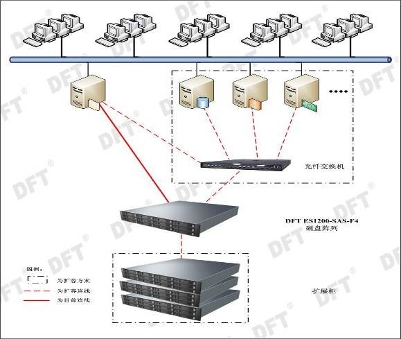 國家林業(yè)局中南院目前的應用是向兩臺服務(wù)器提供大容量存儲,能夠將得到的衛星遙感圖片和一些林業(yè)勘測數據保存下來(lái)以備日后查詢(xún),以及和國家林業(yè)局中心網(wǎng)絡(luò )實(shí)現資源共享。所以我們采用了最新的DFT ES1200-SAS-F4磁盤(pán)陣列(設計容量為2TB)來(lái)滿(mǎn)足用戶(hù)的需求。FC光纖架構是目前企業(yè)級存儲解決方案的最好辦法,通過(guò)高效的FC架構和最新的4GB 光纖技術(shù)能夠滿(mǎn)足用戶(hù)讀寫(xiě)大容量數據的速度。另外,以后隨著(zhù)數據的增加以及服務(wù)器的增加能夠輕松的升級到FC-SAN的架構,保證了用戶(hù)的投資。