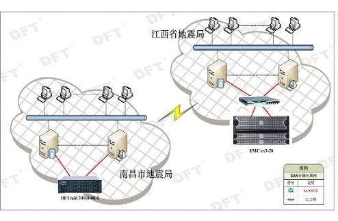 江西省地震局原有存儲系統一套EMC CX3-20磁盤(pán)陣列和磁帶庫用來(lái)本地存放地震監測數據以及數據的離線(xiàn)歸檔備份。而此次實(shí)施方案的目的是將數據通過(guò)電信專(zhuān)線(xiàn)和地震專(zhuān)網(wǎng)在有限的帶寬下將數據備份到南昌市地震局的監控中心。項目采用了DFTraid 3016F4R磁盤(pán)陣列作為主要存儲備份設備,通過(guò)與2臺服務(wù)器的連接來(lái)實(shí)現南昌市地震局11個(gè)地震監測點(diǎn)的數據實(shí)施保存,以及省地震局數據的異地容災備份,對于存儲設備的性能和穩定性要求很高。DFTraid 3016F4R專(zhuān)為目前需求巨大的數據密集應用設計,采用PowerPC 750GL 800MHz高性能處理器。DFTraid 3016F4R最多擁有八個(gè)連接主機的光纖通道環(huán)路接口和超常的讀寫(xiě)性能,采用最新的SAS存儲技術(shù),支持高達80TB存儲容量。