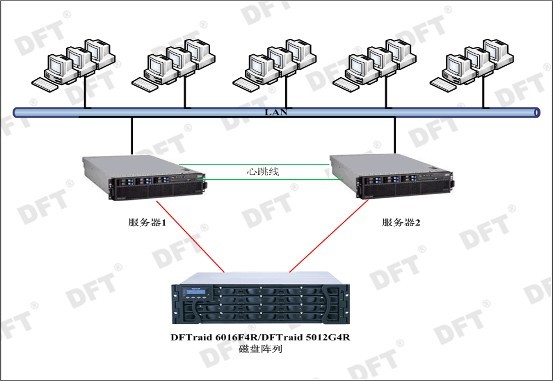 通過(guò)在兩臺服務(wù)器加裝SCSI適配卡或FC適配卡與磁盤(pán)陣列連接,DFTraid 6016F4R/DFTraid 5012G4R磁盤(pán)陣列的RAID功能(支持RAID0,1,1E,5,6,10 and 50)將磁盤(pán)構建成1個(gè)RAID5+SPARE架構保障存儲數據的安全。兩臺服務(wù)器之間通過(guò)兩條心跳線(xiàn)(TCP/IP和RS232)互相監聽(tīng)對方服務(wù)器狀態(tài),由高可用的雙機軟件DFT HA來(lái)負責應用程序的切換,保障了應用程序不會(huì )因為意外宕機而造成服務(wù)中斷。DFT-HA是一套提供有效防止主機意外宕機而造成服務(wù)中斷的軟件,當一臺主機宕機或無(wú)法使用時(shí),DFT-HA能及時(shí)偵測出故障并啟動(dòng)另一臺主機中的相應程序而自動(dòng)接管其服務(wù)。DFT-HA監控和管理每臺服務(wù)器的資源,通過(guò)管理這些資源,DFT-HA能完成自動(dòng)重啟應用的功能。對于異常事件,DFT-HA可以及時(shí)處理,應用在關(guān)鍵業(yè)務(wù)環(huán)節和要求不停頓的商業(yè)環(huán)境。