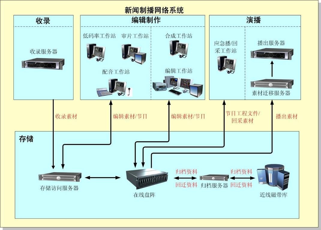 系統整體存儲架構采用在線(xiàn)與近線(xiàn)相結合的方式,采用磁盤(pán)陣列與數據流磁帶庫結合的方式實(shí)現媒體文件的分級存儲。