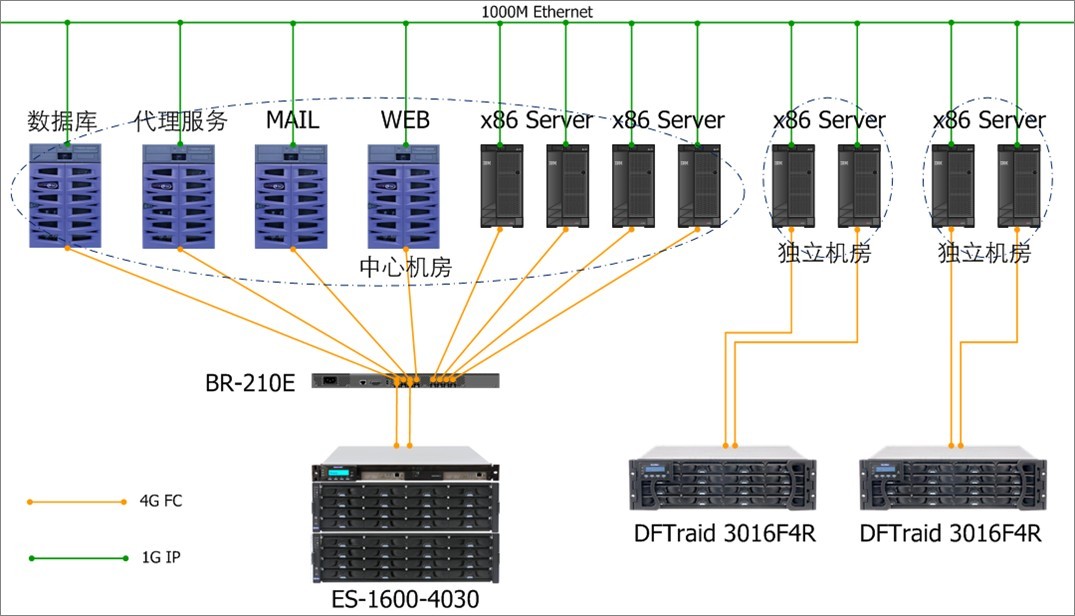 在學(xué)院中心機房中,每臺服務(wù)器中(其中包括1臺oracle數據庫服務(wù)器、代理服務(wù)器、郵件服務(wù)器、WEB服務(wù)器、4臺X86服務(wù)器)安裝一片LPE111-X光纖卡,通過(guò)光纖線(xiàn)與光纖交換機BR-210E連接,DFT ES-1600-4030與光纖交換機連接,DFT ES-1600-4030自帶2個(gè)16盤(pán)位的擴展柜,每個(gè)擴展柜配置16塊750GB SATA硬盤(pán),做RAID5+Spare,使得可用容量達到10.5TB,充分滿(mǎn)足數據存儲需求。