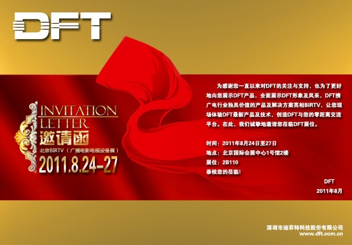 2011年8月24-27日,DFT將攜廣電行業(yè)存儲專(zhuān)屬解決方案首次亮相北京BIRTV。屆時(shí),DFT將在2B110展位開(kāi)設特裝展,全面展示DFT契合廣電行業(yè)應用和發(fā)展需求的多元化產(chǎn)品和解決方案。