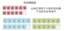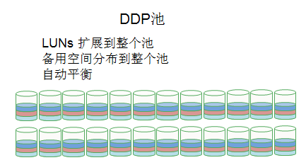 DDP (Dynamic Disk Pools)是GS5400提高RAID性能的一種新方式,磁盤(pán)做成一個(gè)大的硬盤(pán)池,池中所有的硬盤(pán)參與讀寫(xiě), 熱備盤(pán)分布在池中所有的硬盤(pán)內,提高I/O性能,在硬盤(pán)故障時(shí),性能下降很少,增強的存儲運行和故障時(shí)的服務(wù)質(zhì)量,縮短的硬盤(pán)故障的維護時(shí)間。