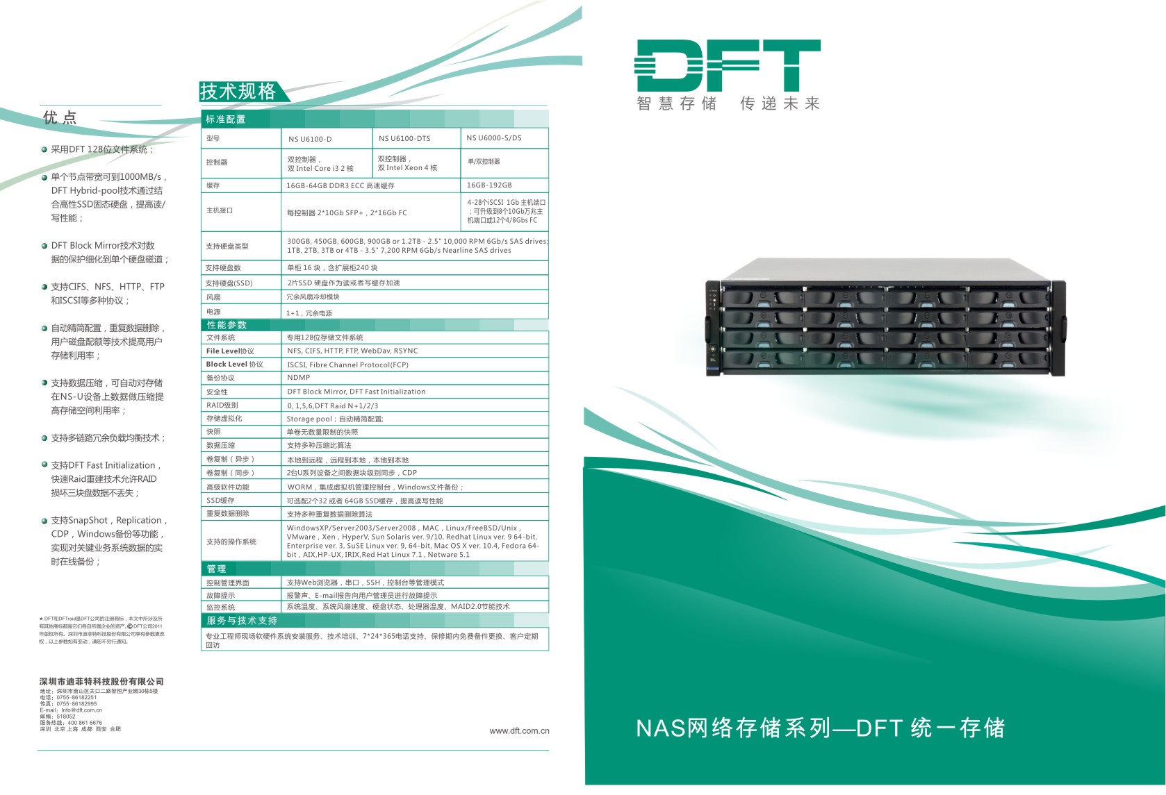 NS-U系列是DFT最新推出的一款適用于中端存儲應用需求,功能豐富的網(wǎng)絡(luò )存儲設備。該產(chǎn)品在同一存儲平臺中,既提供了文件級存儲的NAS功能,同時(shí)也提供數據塊級別的IP-SAN或FC-SAN存儲架構,其功能的多樣性使得用戶(hù)的前期投入成本得到了保護。DFT NS-U系列提供了可視化圖形管理界面,操作簡(jiǎn)單易于管理,其高性能、靈活性及高可靠性完全滿(mǎn)足用戶(hù)對數據及文件存儲性能的要求。該產(chǎn)品主要適用于大型視頻監控、大、中非編網(wǎng)、IPTV、VOD點(diǎn)播等應用。