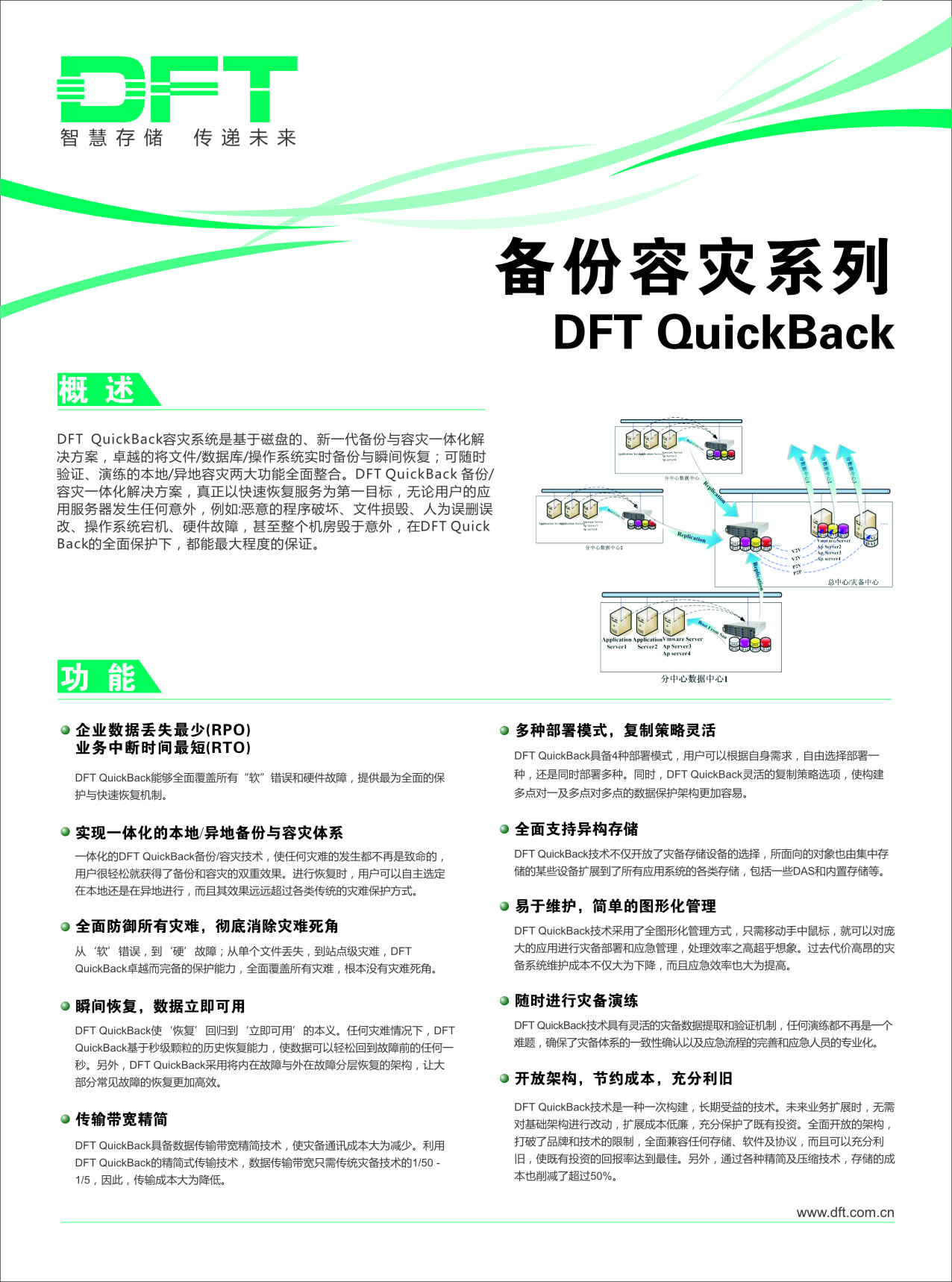 DFT QuickBack災備系統是基于磁盤(pán)的、新一代備份與容災一體化解決方案,卓越的將文件/數據庫/操作系統的實(shí)時(shí)備份與瞬間恢復;可隨時(shí)驗證、演練的本地/異地容災兩大功能全面整合。DFT QuickBack備份/容災一體化解決方案,真正以快速恢復服務(wù)為第一目標,無(wú)論用戶(hù)的應用服務(wù)器發(fā)生任何意外,例如,惡意的程序破壞、文件損毀、人為誤刪誤改、操作系統宕機、硬件故障,甚至整個(gè)機房毀于意外,在DFT QuickBack的全面保護下,都能******程度的保證。